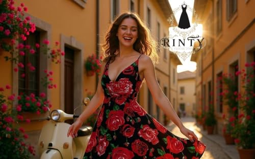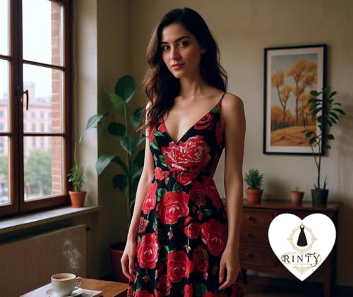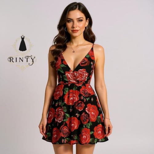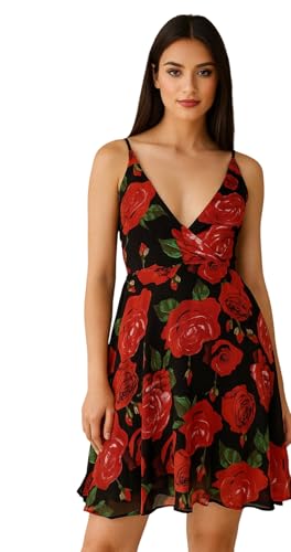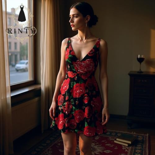 Generic - رينتي فستان سهرة قصير، تصميم زهور الورد الأحمر على خلفية سوداء، قصة V الرقبة، مناسب للحفلات والمناسبات