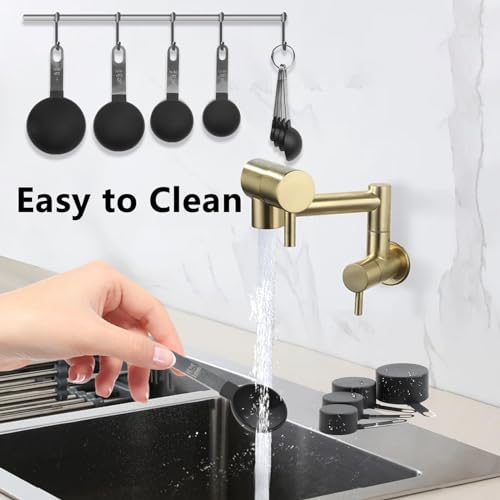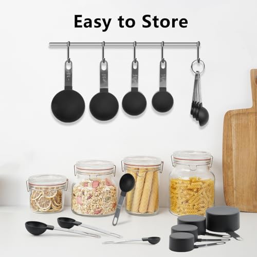 - سهلة التخزين: تأتي مجموعة معالق القياس وكوب القياس مع حلقة مفاتيح سهلة التخزين والإزالة. يمكنك بسهولة إزالة جميع معالق القياس التي تحتاجها من حلقة المفاتيح واستخدامها بعد الانتهاء. ببساطة قم بتعليقها على أي حاوية بخطاف.