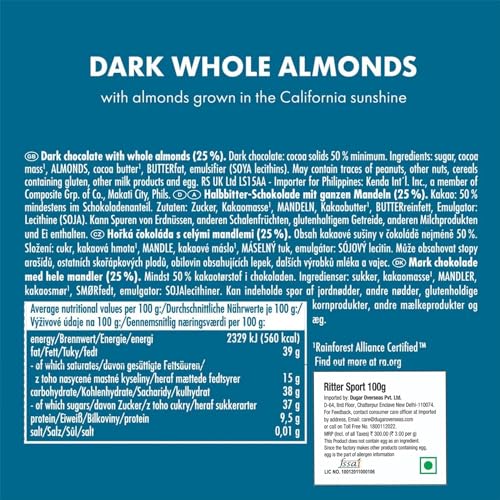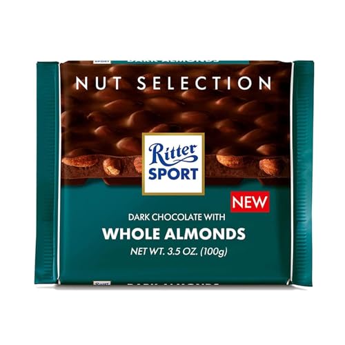 Ritter Sport - شوكولاتة داكنة باللوز الكامل من ريتر سبورت، 100 جم، شوكولاتة مستوردة من ألمانيا