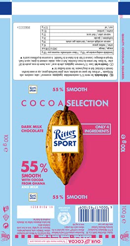 - شوكولاتة داكنة أحادية المنشأ: على وجه الخصوص الكاكاو لصنع لوح من شوكولاتة الحليب الداكنة الناعمة ريتر سبورت بنسبة 55% من غانا