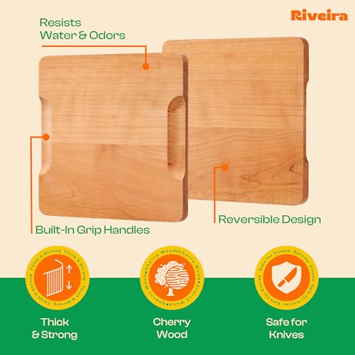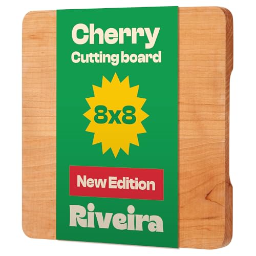 Riveira - لوح تقطيع من خشب الكرز ريفيرا – عظمة الكرز الأسود: لوح تقطيع خشبي بمقاس 20 سم × 20 سم – ألواح تقطيع خشبية مزخرفة للمطبخ – لوح تقطيع من خشب الكرز مزود بمجرى عصير مبتكر