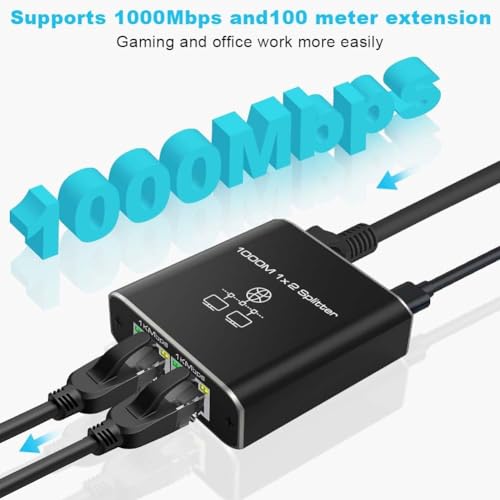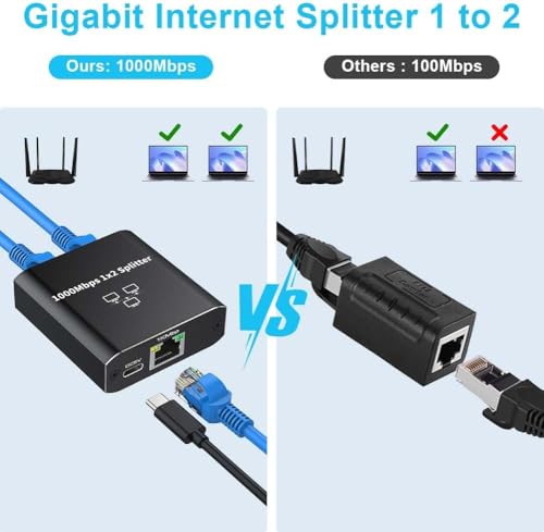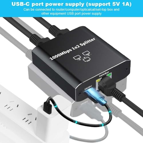 Generic - موزع شبكة RJ45 1 الى 2 جيجابت - محول ايثرنت بسرعة 1000 ميجابت في الثانية مع كيبل طاقة من النوع سي، مفتاح ايثرنت بمنفذين للكمبيوتر والموزع والراوتر وADSL والتلفزيون الرقمي