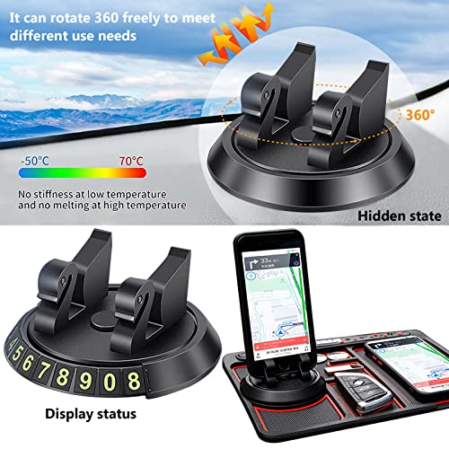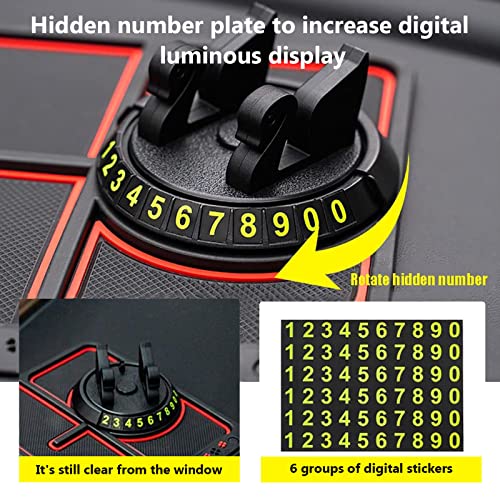 - 【حامل هاتف دوار 360 درجة】: يتميز حامل الموبايل لدينا على القاعدة المضادة للانزلاق بإمكانية الدوران 360 درجة، مما يتيح لك ضبطها بسهولة لتناسب الشاشة الأفقية أو العمودية ليتناسب مختلف زوايا الرؤيا. من خلال ميزة التصميم الدوارة لحامل العرض، يمكنك أن تقرر ما إذا كنت تريد إخفاء رقم الاتصال الخاص بك. باستخدام الملصقات الرقمية المتضمنة (6 مجموعات)، يبقى بإمكانك رؤية رقمك بوضوح حتى لو كنت خارج نافذة سيارتك.