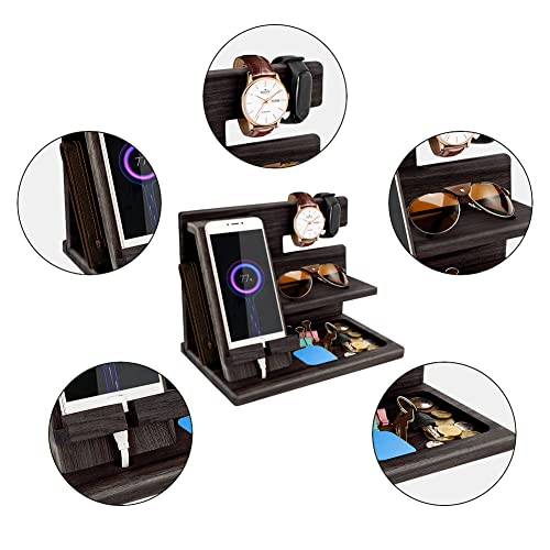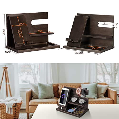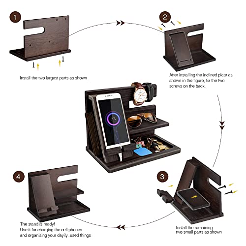 - المنظم سهل التجميع للغاية: حامل المنظم الخشبي ذو التصميم الذكي هذا سريع وسهل التجميع ويتضمن تعليمات (خطوات التثبيت متصلة بالجزء الخلفي من الصندوق) ومفك براغي. قاعدة الشحن متوافقة مع جميع الهواتف المحمولة وتحتوي على مساحات تخزين للمحافظ والنظارات والأقلام والساعات والمفاتيح وغيرها.