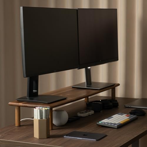 ROCDEER - حامل شاشة مزدوج من خشب الأكاسيا، قاعدة رفع خشبية للشاشات/منصة مكتب خشبية لشاشتين، تدعم الشاشات والطابعات وأجهزة التلفزيون الثقيلة حتى وزن 59 كجم من روكدير