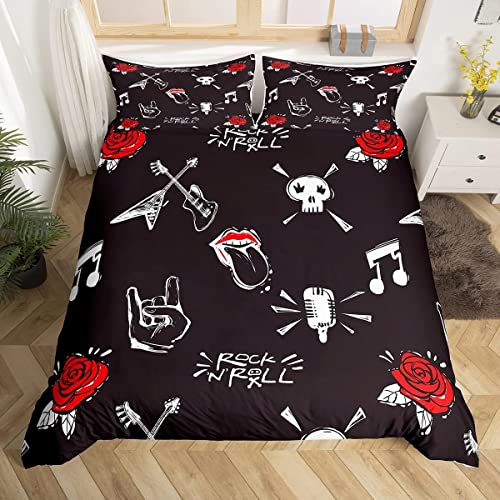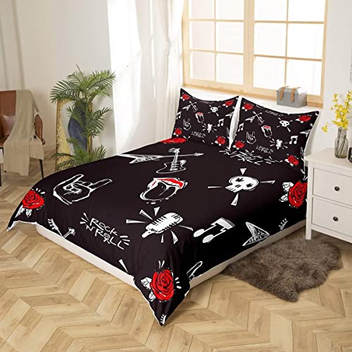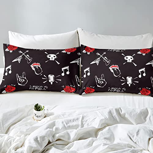 Generic - طقم اغطية سرير للاطفال والبنات بتصميم جمجمة وردية حمراء بنمط موسيقى الروك رول، طقم غطاء لحاف من المايكروفايبر مع 2 كيس وسادة (بدون لحاف) مقاس مزدوج