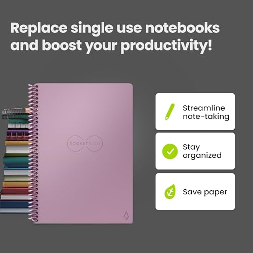 Rocketbook - دفتر ملاحظات ذكي من روكيت بوك قابل لاعادة الاستخدام مصنوع من مواد صديقة للبيئة ومزود بغلاف بلون بينك مع قلم بايلوت فركشين وقطعة قماش مصنوعة من مايكروفايبر - مقاس اكسسكيوتيف (15×22 سم)