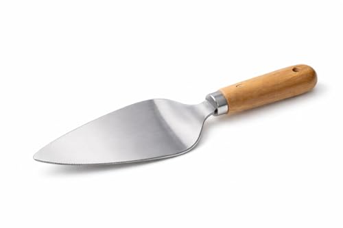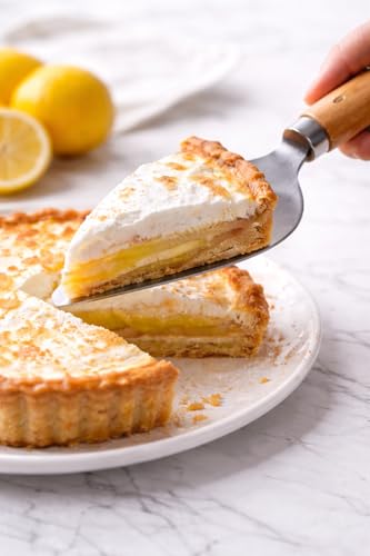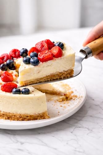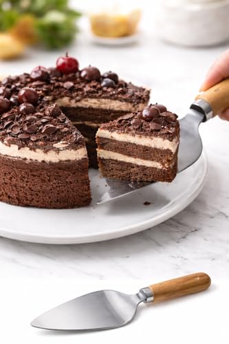 - مقبض مريح من الخشب الطبيعي: يتميز بمقبض ناعم ومدبب مصنوع من الخشب الصلب الطبيعي. توفر قبضة مريحة وتبقى باردة وشعورًا متوازنًا، مما يجعل من السهل تقديم شريحة مثالية في كل مرة.
