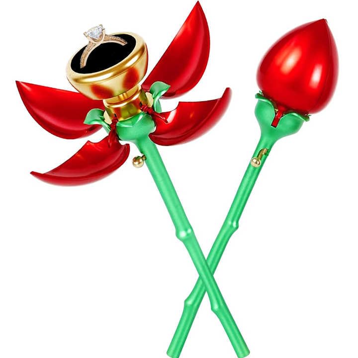 - تصميم مميز: حامل خاتم على شكل وردة رومانسية بألوان أحمر وأخضر مع قاعدة ذهبية لعرض خاتم الخطوبة بشكل أنيق