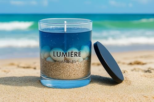 - ١) تصميم فاخر: شمعة زجاجية أنيقة مع تصميم مستوحى من البحر، تجمع بين الشمع الأزرق والرمال الطبيعية مع زخارف بحرية