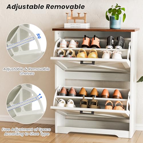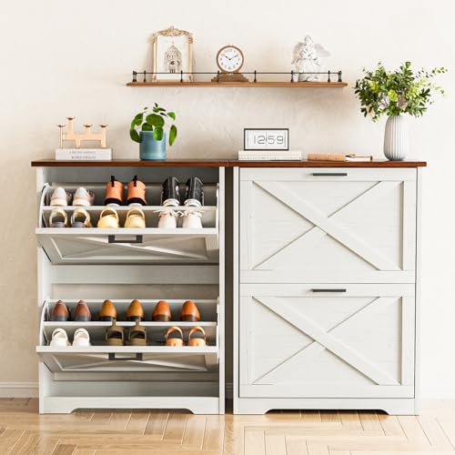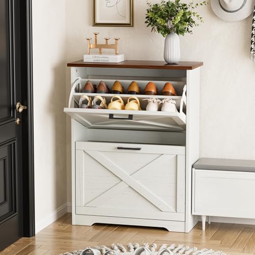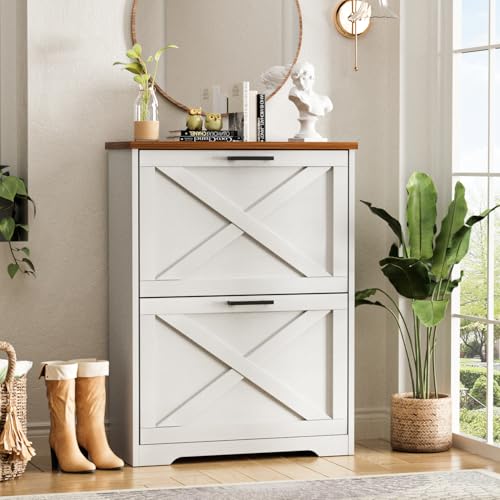 ROMMAK - خزانة احذية للمدخل مع درجين قلابين، طبقتان قائمة بذاتها، خزانة تنظيم احذية ضيقة ورفيعة للمدخل والرواق وغرفة المعيشة، لون ابيض من روم ماك