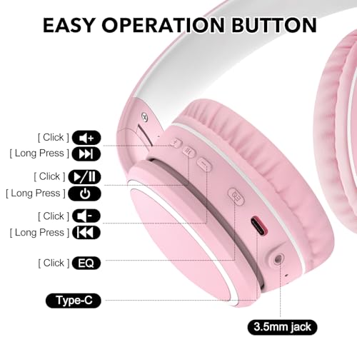 RORSOU - رورسو سماعات بلوتوث B10 فوق الاذن، خفيفة الوزن قابلة للطي ستيريو باس لاسلكية وسلكية مع ميكروفون، وقت تشغيل 50 ساعة، تحكم في مستوى الصوت، سماعات بلوتوث 5.3 للايباد/السفر/التابلت/الكمبيوتر (زهري)