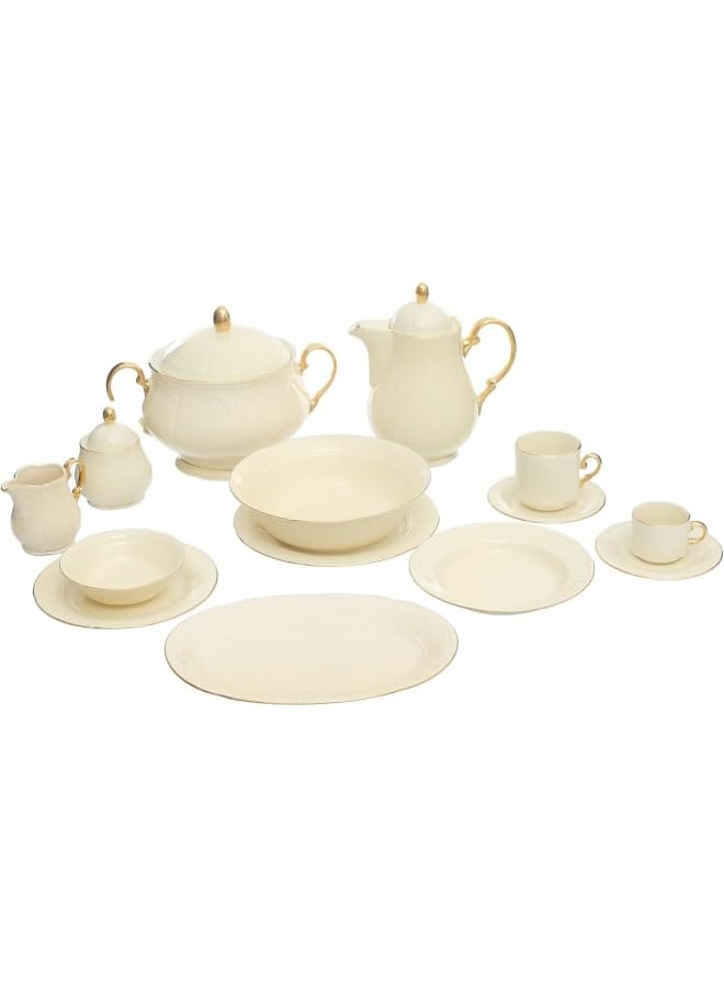 generic - طقم عشاء كونراد مع 57 قطعة ذهبية من روزا اوسا، كريمي: طبق تقديم واحد، 2 مع اغطية، 12 كوب قهوة وشاي و6 كيك و6 اطباق مسطحة و6 اطباق عميقة و6 اوعية حساء و1 ابريق حليب و2 وعاء سكر و2 ابريق شاي مع اغطية.