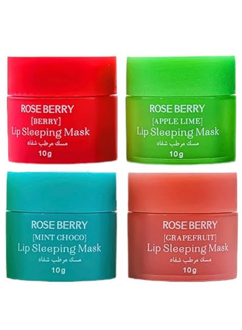 Rose Berry - ماسك الشفاه الليلي من روز بيري، 4 نكهات (توت، تفاح وليمون، نعناع وشوكولاتة، جريب فروت)، 10 جم لكل منها