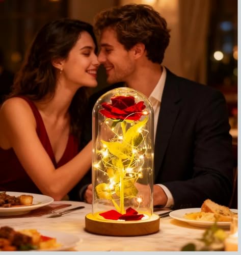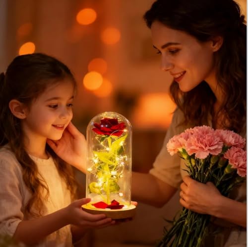- تأتي مع شريط إضاءة LED ملفوف حول الوردة والقاعدة الخشبية، مما يمنحها توهجًا ناعمًا ودافئًا.