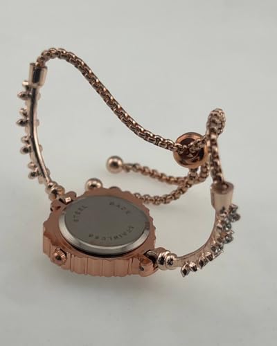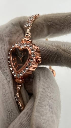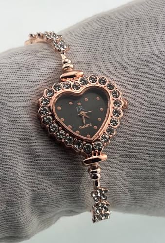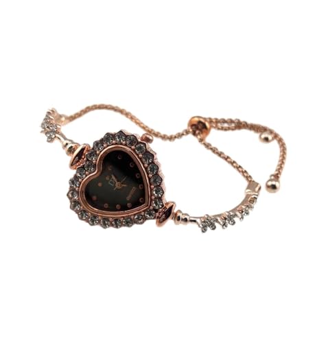 Generic - ساعة كوارتز للنساء على شكل قلب بلون ذهبي وردي - سوار قابل للتعديل مع احجار لامعة - مينا اسود