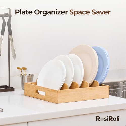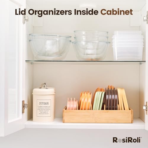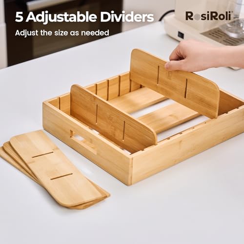 RosiRoli - منظم أغطية بامبوبـ 5 فواصل قابلة للتعديل من روزيرولي - منظم لخزانة المطبخ القابلة للتوسيع وأدراج التخزين مناسب للأغطية البلاستيكية وحاويات الطعام والأطباق