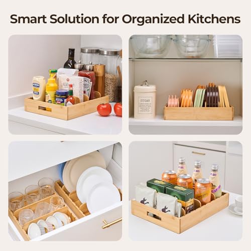 - 【مصنوع من خيزران صديق للبيئة ومتين】منظم الخيزران الخاص بنا مصنوع من مواد طبيعية ومقاوم للخدش وأقوى بنسبة 16% من خشب القيقب. تحمي اللمسة النهائية الناعمة الأغطية وأواني الطهي وتمتزج بسلاسة مع المطابخ العصرية.