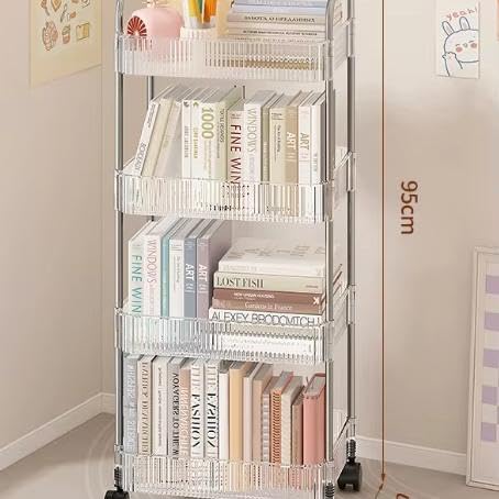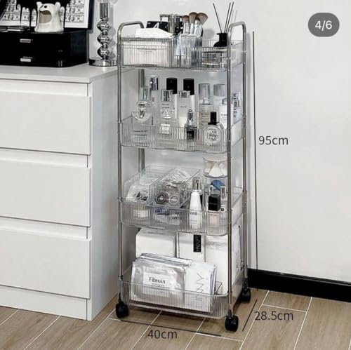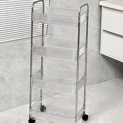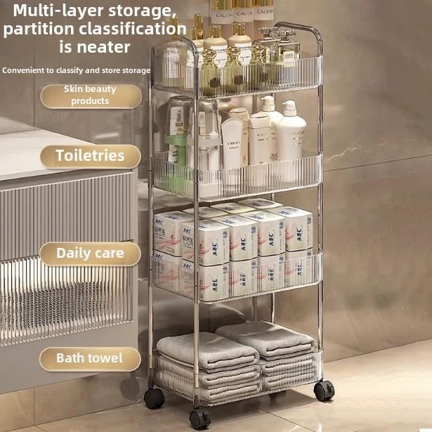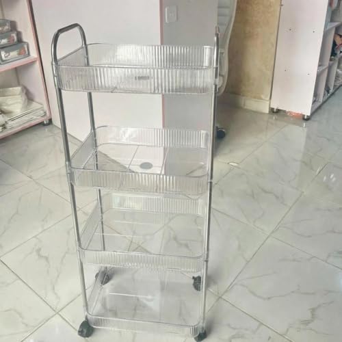 - This versatile four-tier rolling cart offers exceptional storage capacity for bathrooms, offices, or kitchens. Its transparent acrylic shelves provide clear visibility of contents while the sturdy metal frame ensures long-lasting durability and resistance to rust. The vertical design maximizes storage space without occupying a large footprint, making it perfect for small areas. Smooth-rolling casters allow effortless movement between rooms, enabling flexible placement wherever organization is ne