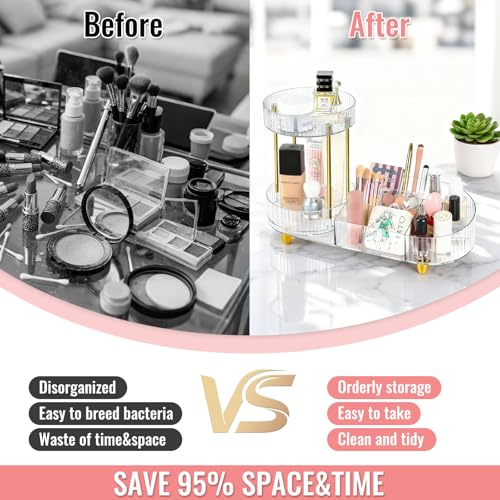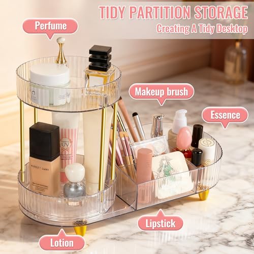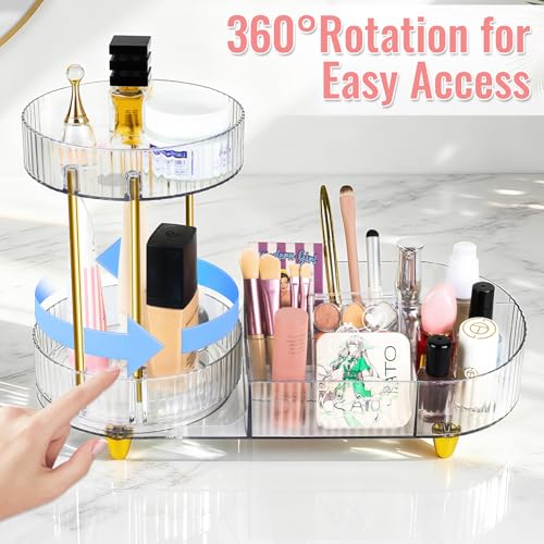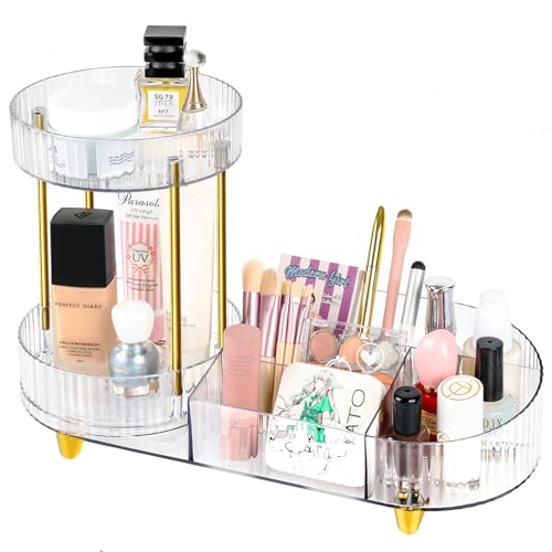 MOXYOY - منظم مكياج دوار 360 درجة 2 في 1، منظم مستحضرات التجميل والعطور للعناية بالبشرة لطاولة الزينة وسطح الطاولة وغرفة النوم (شفاف)