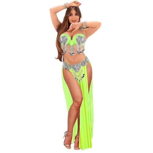 Generic - فستان رقص شرقي من رو، طراز ماكسي، مصنوع من مواد مرنة خفيفة، بتصميم دانس سوت، للنساء، مطاطي، بدون أكمام، باللون الأخضر الفوسفوري، مقاس صغير جداً