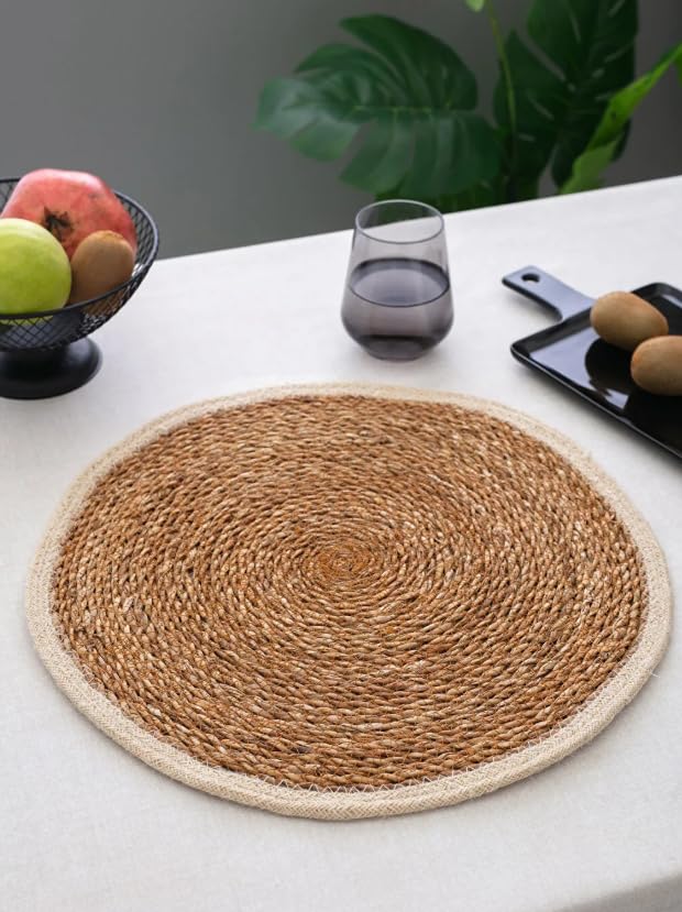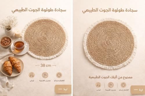 - مادة الجوت الطبيعية: منسوجة يدويًا من ألياف الجوت الطبيعية عالية الجودة بنمط حلزوني مضفر جميل مع حواف شراشيب مزخرفة، مما يضيف سحرًا ريفيًا ودفئًا إلى طاولة الطعام أو القهوة