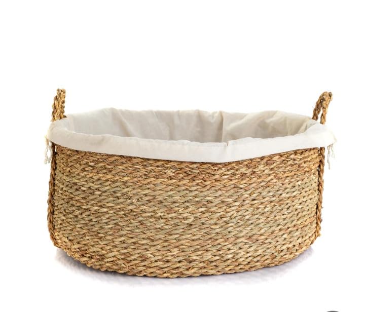 عام - سلة تخزين دائرية من الاعشاب البحرية بمقابض وبطانة قطنية، طبيعية، 15 سم