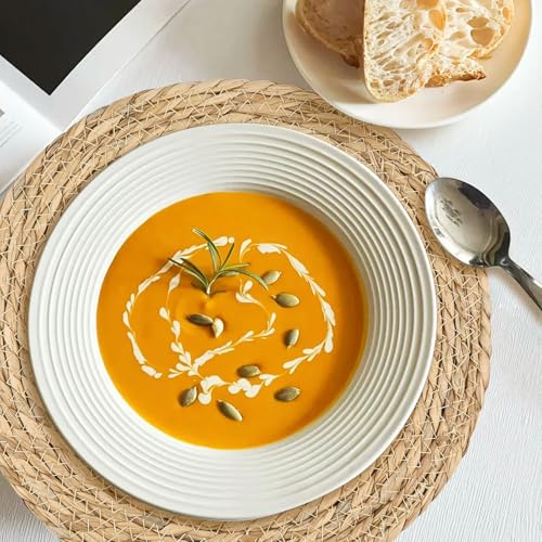 - مفارش فاخرة بنسيج محبوك من الراتان: طقم من ستة مفارش دائرية بتصميم بوهيمي مقاس 30 سم، مصنوعة يدويًا من الراتان الطبيعي للحصول على مظهر أنيق لمنزل بطابع ريفي. مثالية كمفارش فردية للطاولة أو قاعدة للأواني الساخنة في المطبخ.