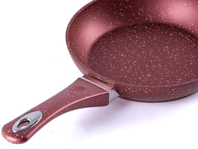 • تصميم فاخر: مقلاة جرانيت دائرية مقاس 24 سم بلمسة نهائية حمراء منقطة ومقبض مريح لتجربة طهي مريحة
