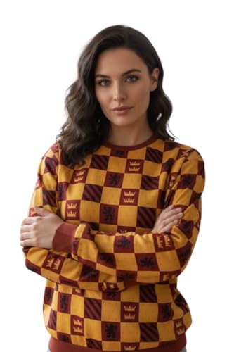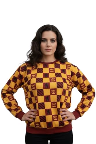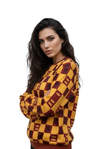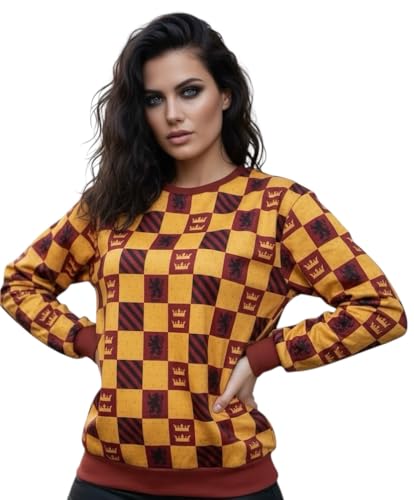 Generic - سويت شيرت مطبوع بنقشة الشطرنج الملكية، أصفر وأحمر خمري، تصميم كلاسيكي مع تفاصيل التاج والأسد المقاس لارج