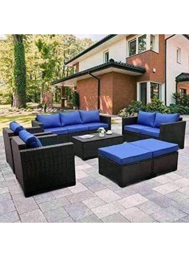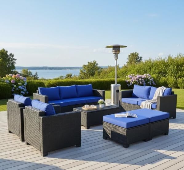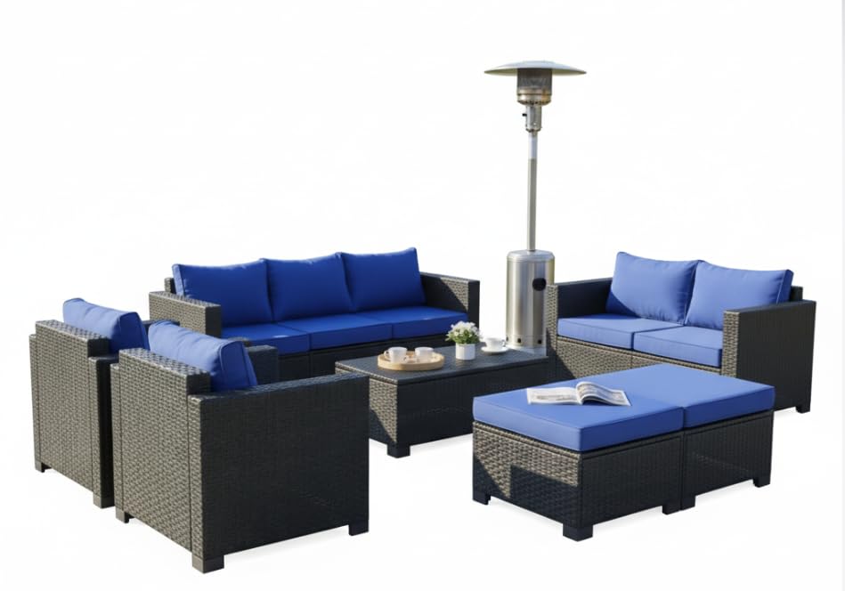 - تصميم متعدد الاستخدامات: تصميم حديث مع وسائد زرقاء ولمسة راتان سوداء يناسب مختلف المساحات الخارجية بما في ذلك الحدائق والأفنية والتراسات والشرفات، مما يعزز أي ديكور خارجي.