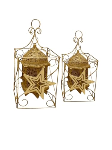 Generic - طقم فانوس رمضان على الطراز الملكي بتصميم نجمة - فوانيس شموع معدنية اسلامية لتزيين الطاولة او الارضيات، رمضان والعيد (مقاس M)