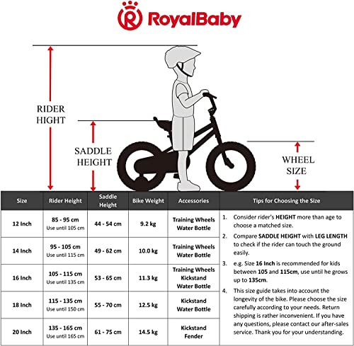 - 30 سم= 2.5-4.5 سنوات، 35 سم = 3.5-5.5 سنوات، 40 سم =5.1-7.5 سنوات، 46 سم =6.5-9 سنوات (توصية العمر التقريبية هي للإرشاد العام فقط، يرجى قياس طول الساق الداخلي للطفل ومقارنته بجدول تفاصيل الدراجة وفقًا لذلك). تمت ترقية مقاس 46 سم إلى المقعد الأسود الكبير مع عمود قاعدة طويل. قد يختلف نمط عجلة التدريب الخاصة بالمثبت.