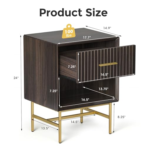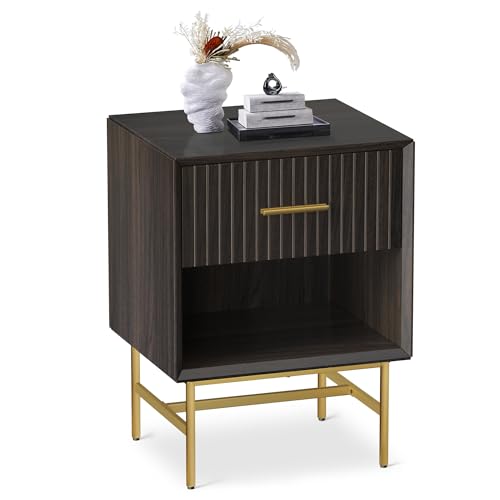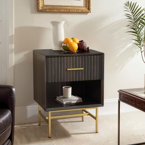 RoyalCraft - طاولة جانبية مع درج من رويال كرافت، طاولة جانبية بارجل معدنية، طاولة جانبية من طبقتين، خزانة عصرية لغرفة النوم وغرفة المعيشة والمكتب المنزلي، لون بني فحمي