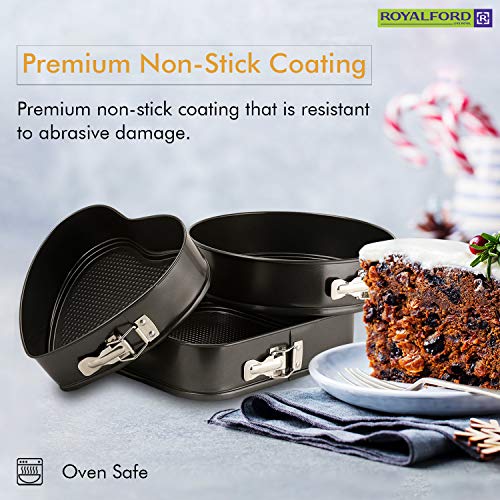 Royalford - علب كيك من سبرينج فورم 3 قطع رويال فور - سريعة الفك غير لاصقة امنة للاستخدام في الفرن وخالية حمض بيرفلورو الاوكتانويك وخالي مادة بيسفينول أ - سم ك 0.4 ملم صلب كربون أسود