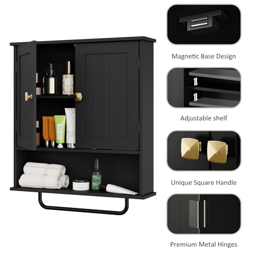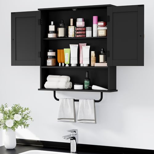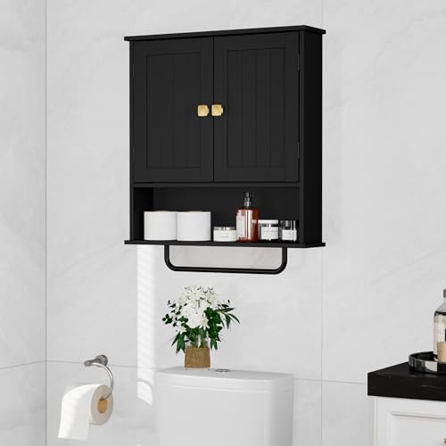 RRX - ار ار اكس خزانة ادوية تثبت على الحائط مع قضيب للمنشفة، خزانة تخزين فوق المرحاض مع بابين ورف قابل للتعديل، خزانة حائط بيضاء للحمام والغسيل والمطبخ (اسود)
