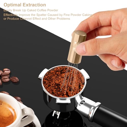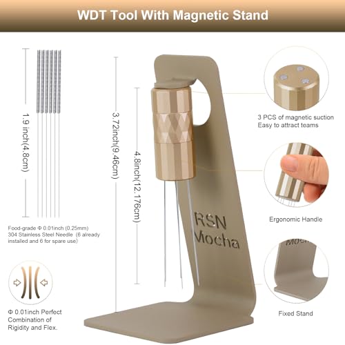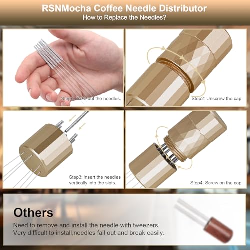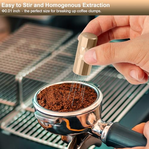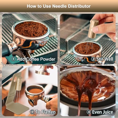 RSNMocha - اداة توزيع الاسبريسو دبليو دي تي من ار اس ان موكا، اداة توزيع القهوة مع حامل مغناطيسي، ملحقات اسبريسو مع 6 ابر اضافية من الستانلس ستيل بقطر 0.25 ملم للباريستا - ذهبي غني