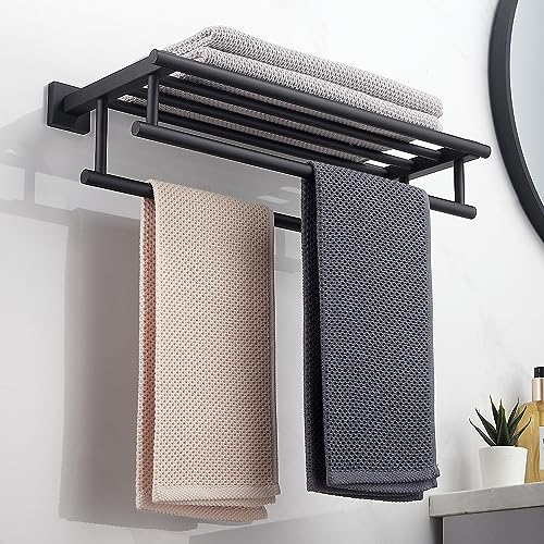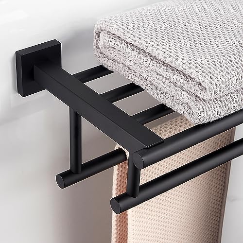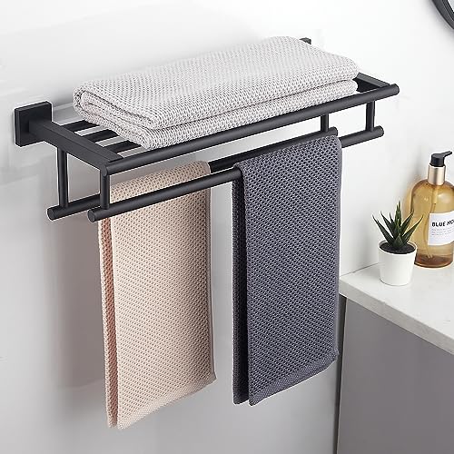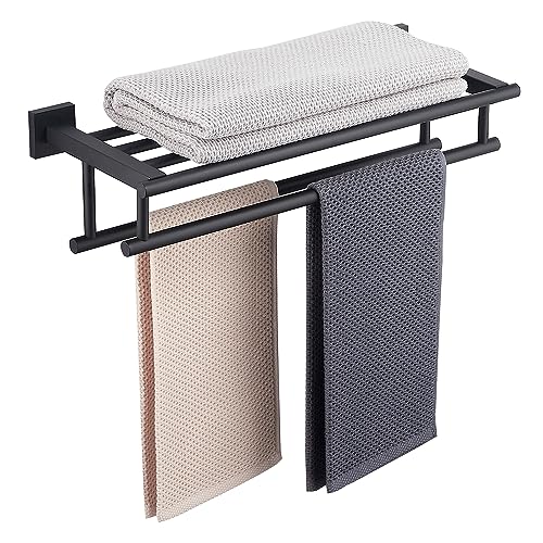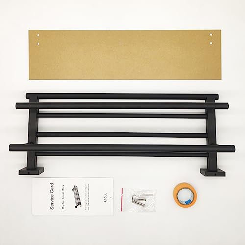 RTCUL - رف مناشف الحمام مع قضيب منشفة مزدوج 20 انش للحمام والفندق رف دش SUS304 حامل عصري من الستانلس ستيل يثبت على الحائط بلون اسود غير لامع