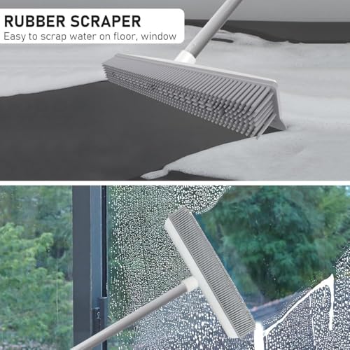 Lonimia - مقشة مطاطية مع شرشوبة 2 في 1، مساحة مطاطية بمقبض طويل قابل للتعديل، فرشاة لتنظيف البلاط لإزالة شعر الحيوانات الأليفة والقطط والكلاب وتنظيف السجاد والمطبخ والحديقة والفناء والنوافذ، أبيض
