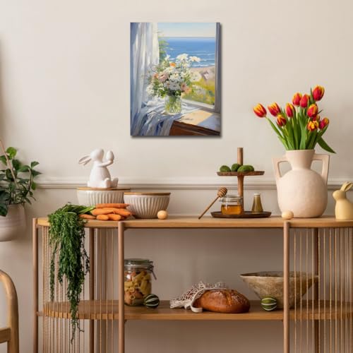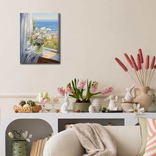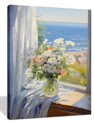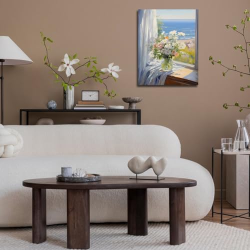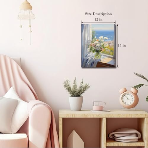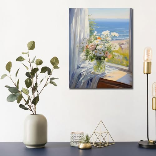 - لوحة فنية بطباعة زهور بلون أبيض ووردي وبحر أزرق، مقاس الإطار. لوحة قماشية مقاس (30 سم × 38 سم)، مطبوعات قماشية زرقاء أنيقة بطابع الزهور، ديكور حائط عصري.