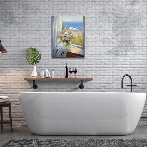 RUIFENGL - لوحة فنية من القماش بطباعة زهور بلون أبيض ووردي في زجاجة مع بحر أزرق، لوحات مرسومة بالألوان المائية وجاهزة للتعليق لديكور المنزل والمكتب والحمام وغرفة النوم من رويفنجل، مقاس 30.5×38.1 سم، حجم صغير