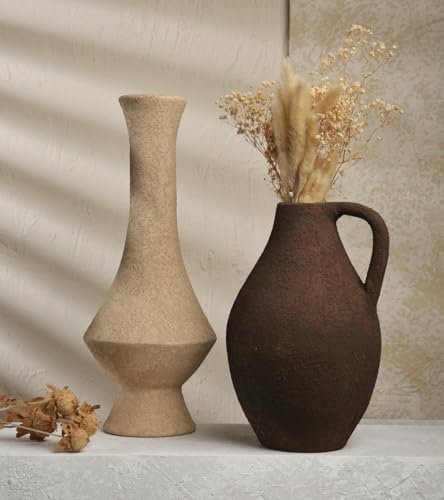 - مزايا التصميم: تتضمن المجموعة مزهريتين حرفيتين - مزهرية طويلة بيج برقبة أنيقة ووعاء بني على طراز أمفورا بمقبض