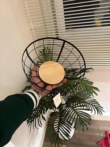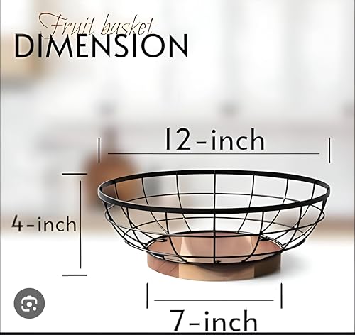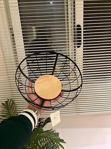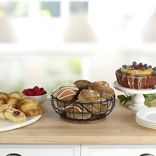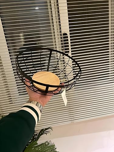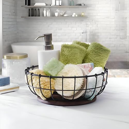 Generic - منظم مطبخ ريفي - سلة فاكهة سلكية معدنية مع حامل خشبي، تصميم دائري اسود لمطبخ بيت المزرعة، حل تخزين انيق