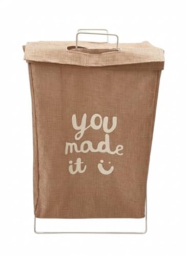Generic - سلة غسيل من الكتان الريفي مع اطار معدني، سلة تخزين من القماش البني مع نص "You Made It" لتنظيم المنزل