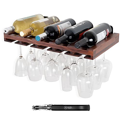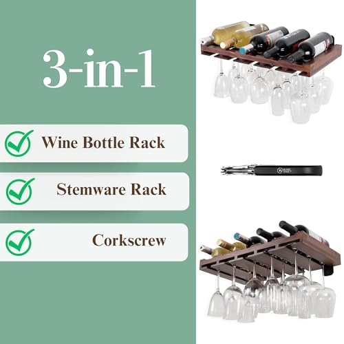 Rustic State - راستيك ستيت رف نبيذ يثبت على الحائط من بالومينو، حامل لتخزين زجاجات المشروبات الكحولية، رفوف للادوات الجذعية وفتاحة براغي ملولبة بلون الجوز