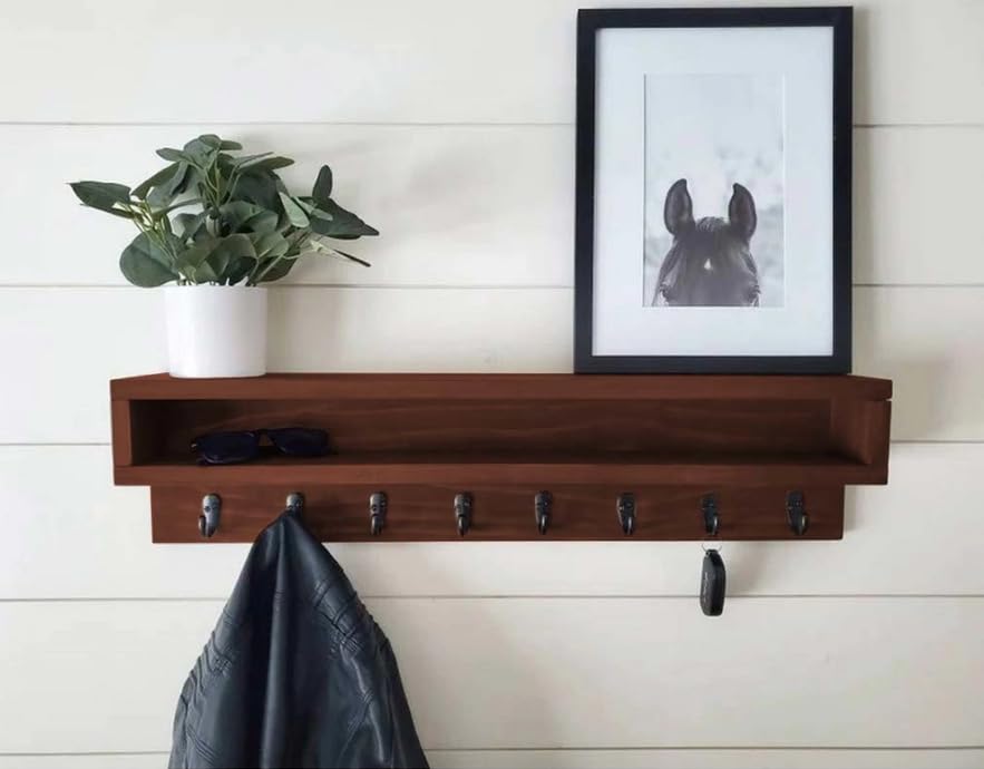 - تصميم متعدد الاستخدامات: رف معطف مثبت على الحائط مع رف يجمع بين التخزين والأناقة، ويتميز برف علوي واسع للعناصر الزخرفية وحافة تخزين عملية للملحقات الصغيرة