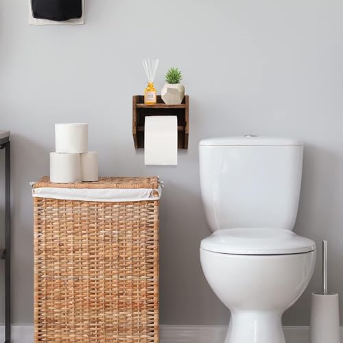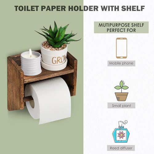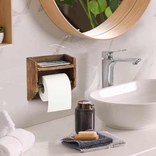 Hossejoy - حامل ورق تواليت خشبي ريفي مع رف، حامل موزع ورق، حامل مناديل يثبت على الحائط مع رف تخزين للهاتف