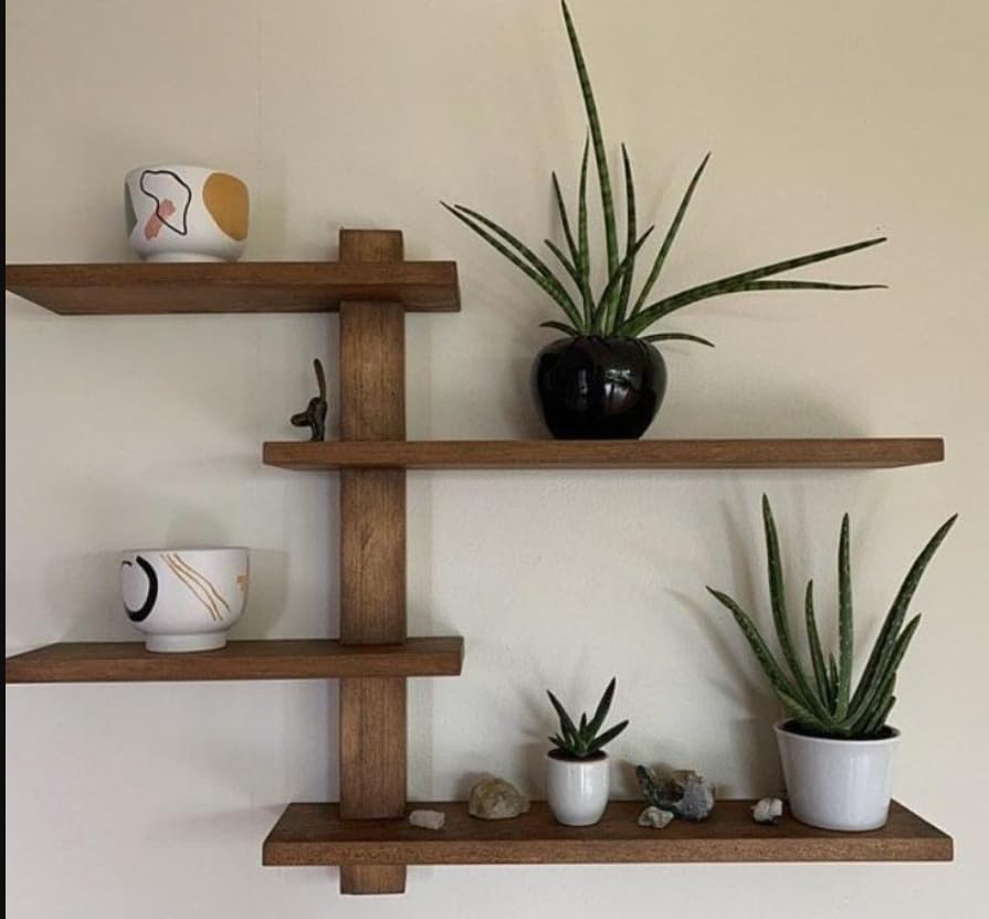 - التصميم: رف حائط عائم من 4 طبقات بنمط ريفي عصري مع تصميم غير متماثل يخلق عرضًا لافتًا للنظر للعناصر والنباتات الزخرفية