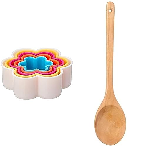 Rustomart - مجموعة ادوات تقطيع البسكويت على شكل زهرة من راستوم ارت، مصنوعة في الصين متعددة الالوان + ملعقة خشبية كبيرة من راستوم ارت، مصنوعة في الصين بيج
