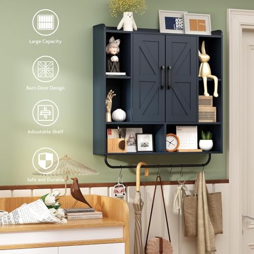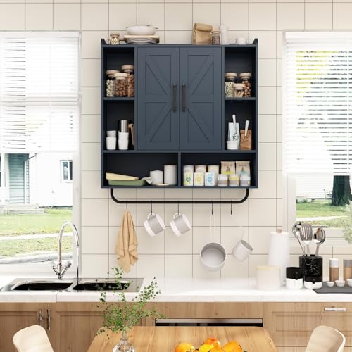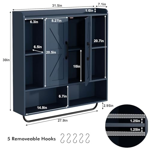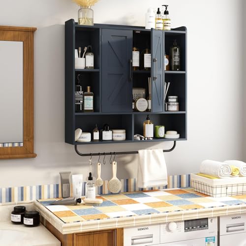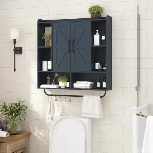 RUSTOWN - دولاب حائط خشب بتصميم ريفي للحمام، خزانة أدوية تثبت على الحائط، وحدة تخزين موفرة للمساحة ببابين ورفوف قابلة للتعديل من 3 أدوار وحامل فوط من راستاون (أزرق كحلي)